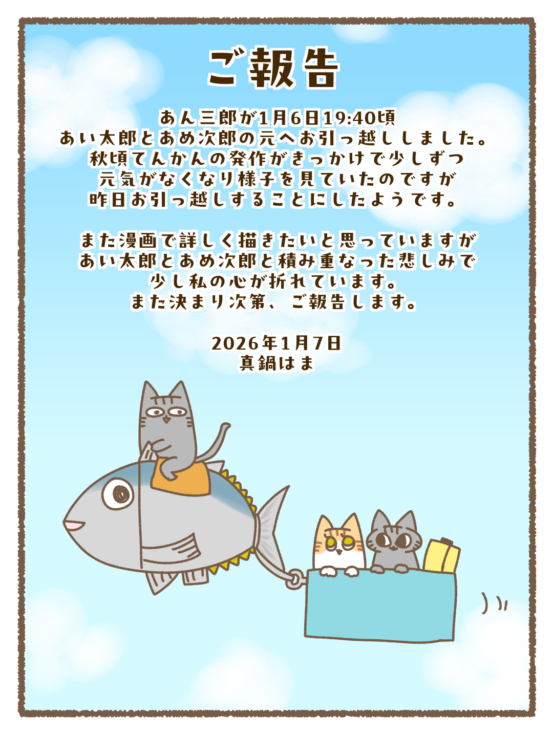 あん三郎についてご報告 2026.01.07 ご報告 あん三郎 ご報告 あとがき ご報告でした。 インスタで毎日やっている朝のイラスト投稿は続ける予定ですが猫漫画の方は少し心が折れています…すみません。 10 同じカテゴリの記事 あん三郎についてご報告 投稿再開&リハビリ漫画 Kindle⑫猫5匹との暮らしまとめ③出ました! あい太郎とお引越しまとめ出ました! 重★大★発★表 kindleのお知らせ 読者投票のコメントを受け取りました!+すみません あめ次郎についてのご報告 Kindle新刊出ました! Kindleまとめ②でました! Kindleで日常まとめ①が出ました キャッツ達のグッズ作りました ぽん四郎とちゃん五郎との出会いKindleインディーズ出ました お知らせ:Kindle3巻目出ました あめ次郎との出会いまとめ出ました 電子書籍出版しました お知らせ あい太郎についてご報告 前の記事 1月2日その2 2026.01.03 次の記事 記事がありません アプリなら通知ですぐ読める! NAPBIZブログ