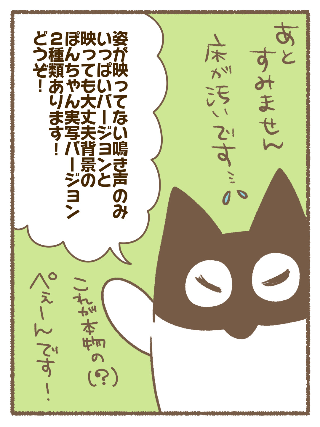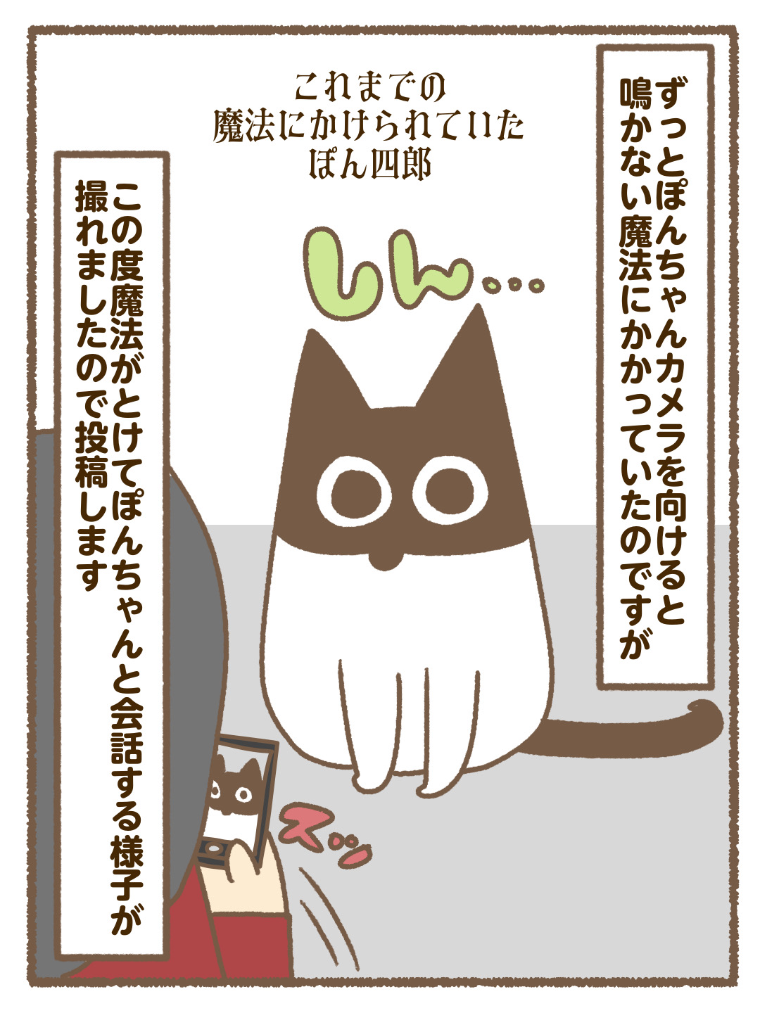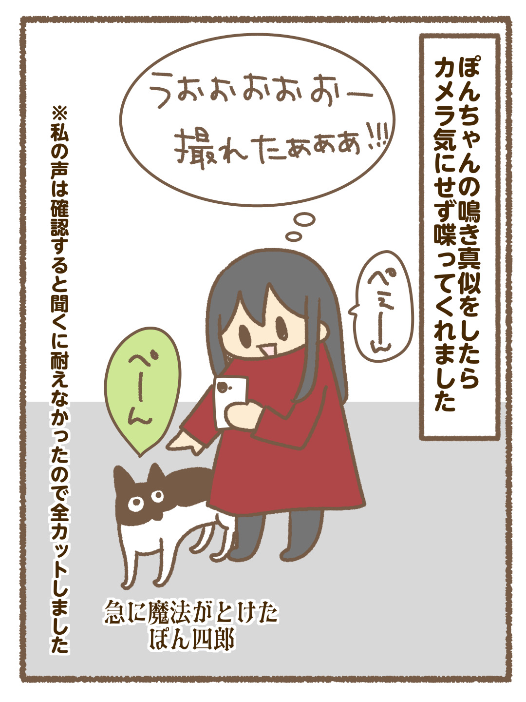 猫漫画を描いて3年…カメラで前で鳴いてくれなかったぽん四郎でしたが、急に魔法が解けて鳴いてくれて撮れました…この声が漫画でぺぇーんになっています。